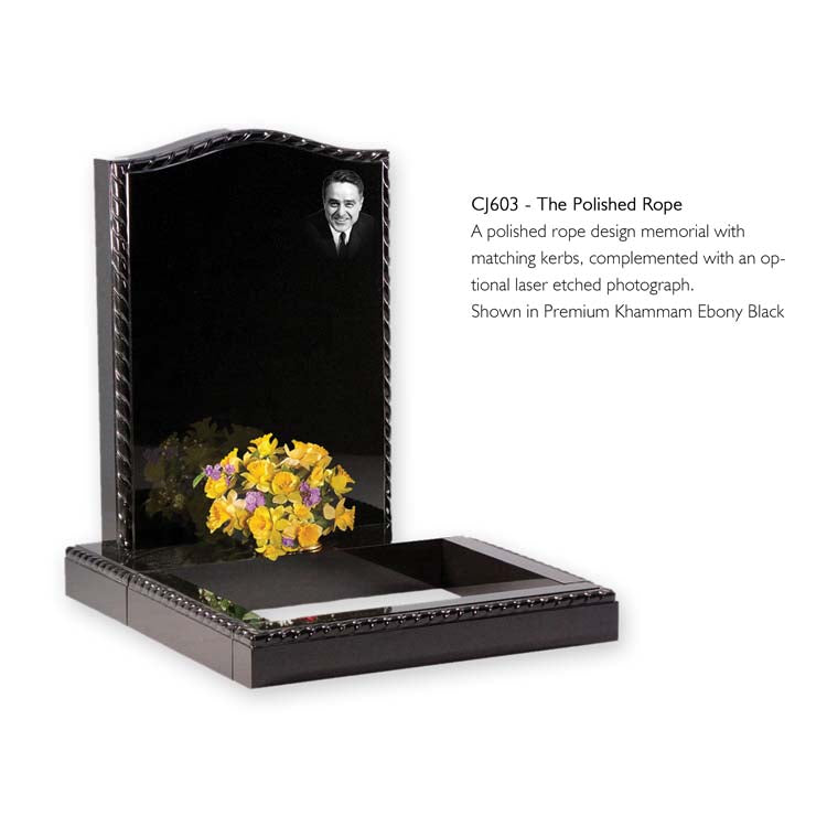 A polished rope design memorial with matching kerbs, complemented with an optional laser etched photograph. Shown in Premium Khammam Ebony Black.