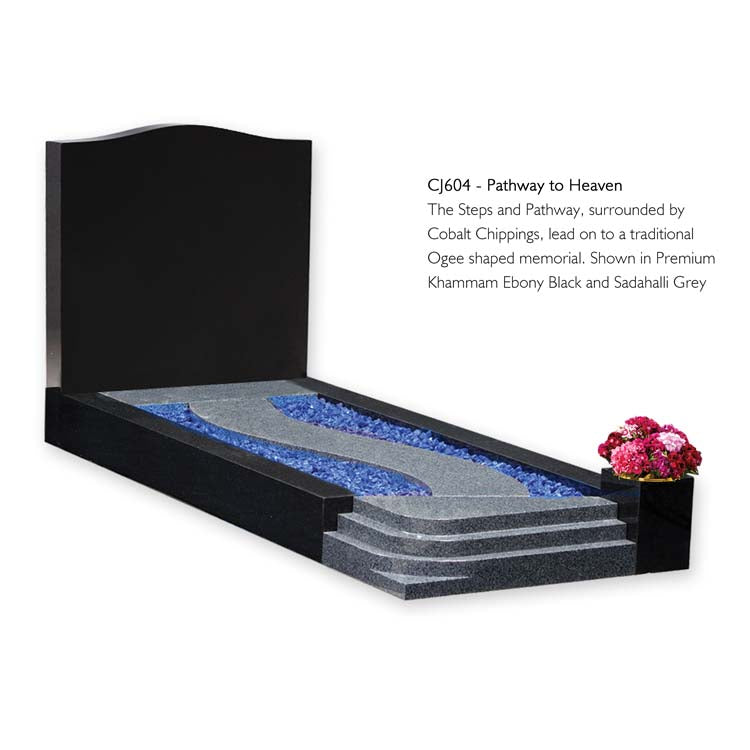 The Steps and Pathway, surrounded by Cobalt chippings, lead on to a traditional Ogee shaped memorial. Shown In Premium Khammam Ebony Black and Sadahalli Grey.