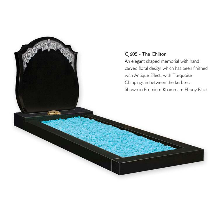 An elegant shaped memorial with hand carved floral design which has been finished with Antique Effect, with Turquoise Chippings in between the kerbset. Shown in Premium Khamman Ebony Black.