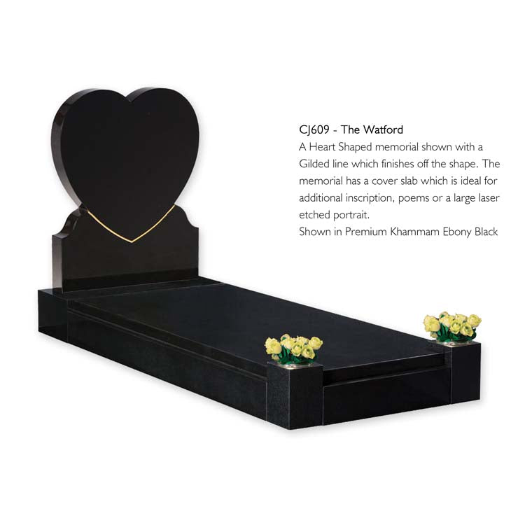 A Heart Shaped memorial shown with a Gilded line which finishes off the shape. The memorial has a cover slab which is ideal for additional inscription, poems or a large laser etched portrait. Shown in Premium Khammam ebony Black.
