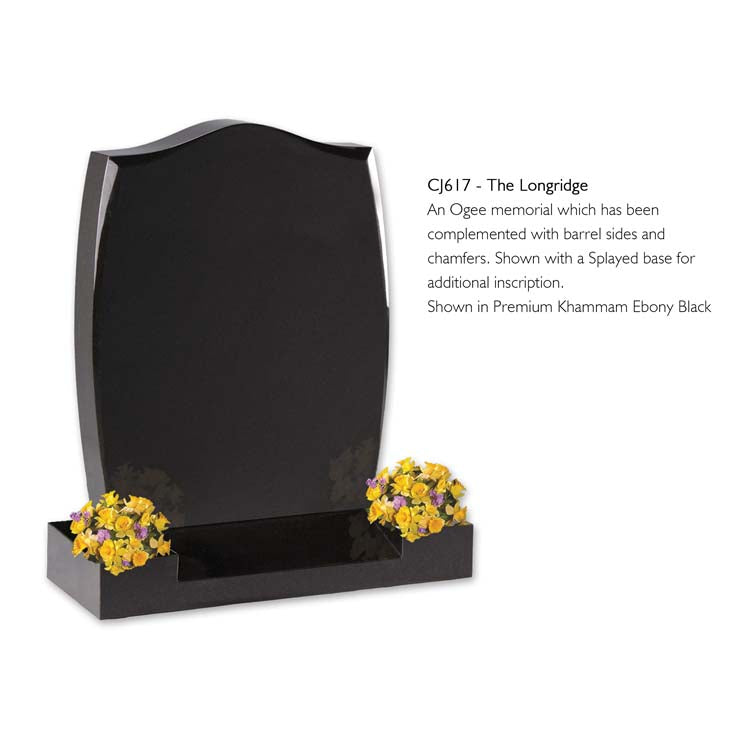 An Ogee memorial which has been complemented with barrel sides and chamfers. Shown with a Splayed base for additional inscription. Shown in Premium Khammam Ebony Black.