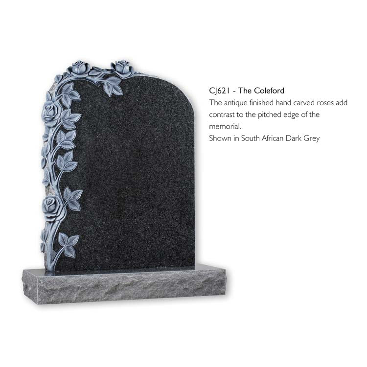 The antique finished hand carved roses add contrast to the pitched edge of the memorial. Shown in South African Dark Grey.