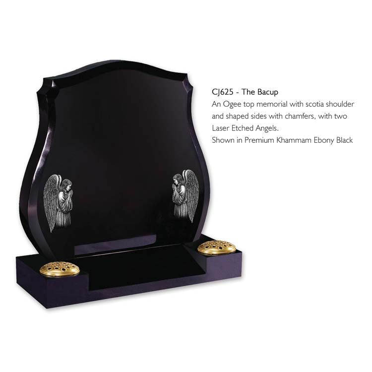 An Ogee top memorial with scotia shoulder and shaped sides with chamfers, with two Laser Etched angels. Shown in Premium khammam Ebony Black.
