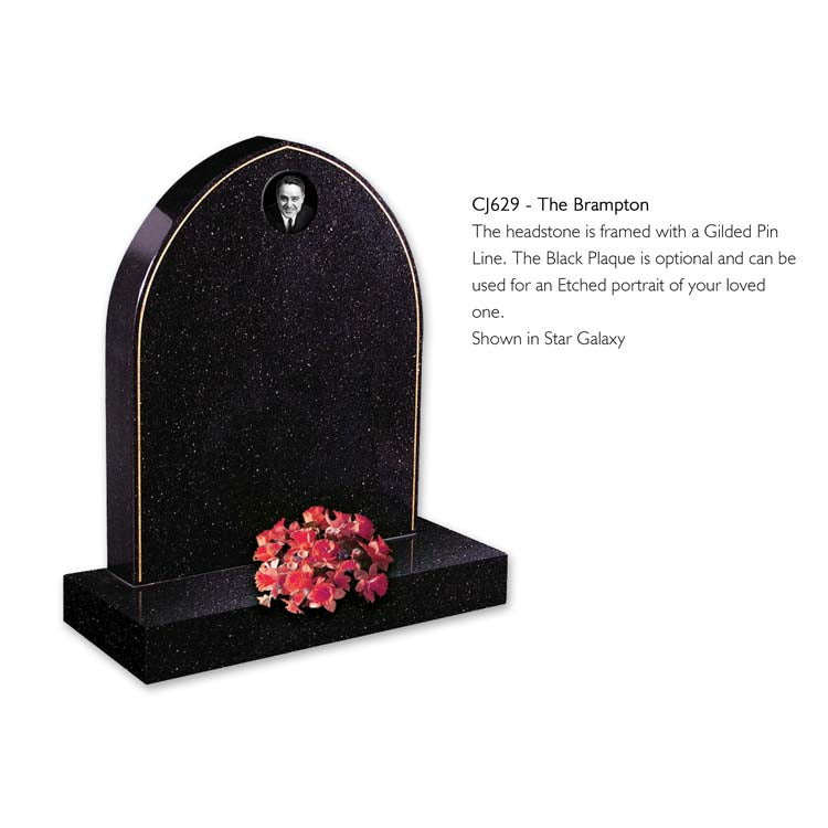 The headstone is framed with a Gilded Pin Line. The Black Plaque is optional and can be used for an Etched portrait of your loved one. Shown in Star Galaxy.