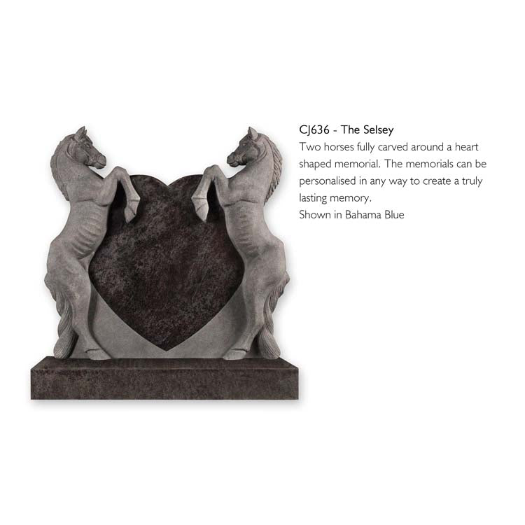 Two horses fully carved around a heart shaped memorial. The memorials can be personalised in any way to create a truly lasting memory. Shown in Bahama Blue.