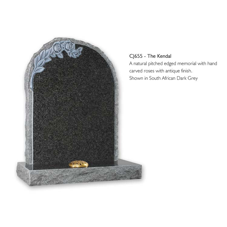 A natural pitched edged memorial with hand carved roses with antique finish. Shown in South African Dark Grey.