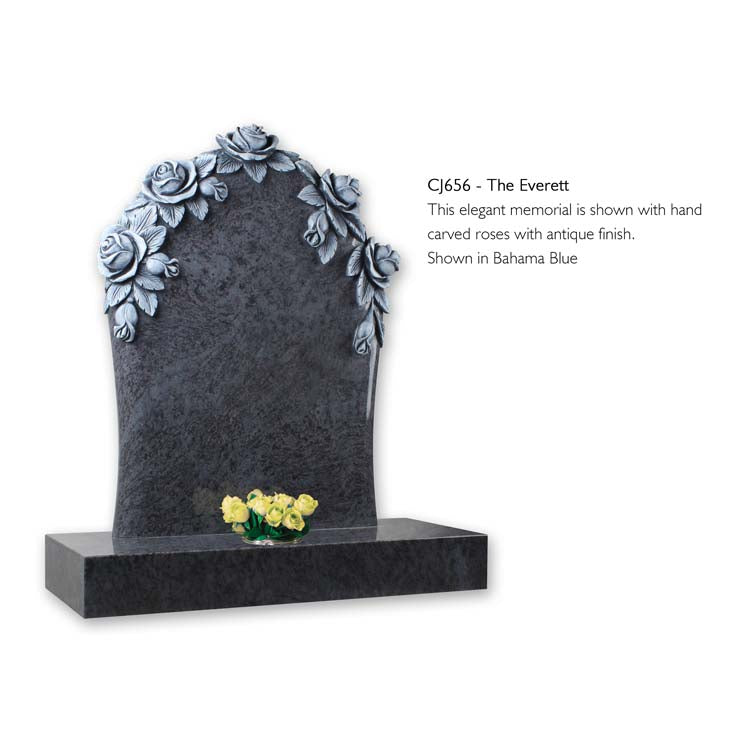 This elegant memorial is shown with hand carved roses with antique finish. Shown in Bahama Blue