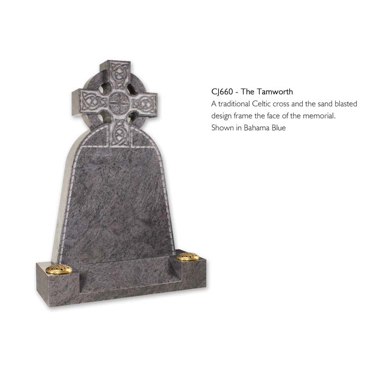 A traditional Celtic cross and the sand blasted design frame the face of the memorial. Shown in Bahama Blue.