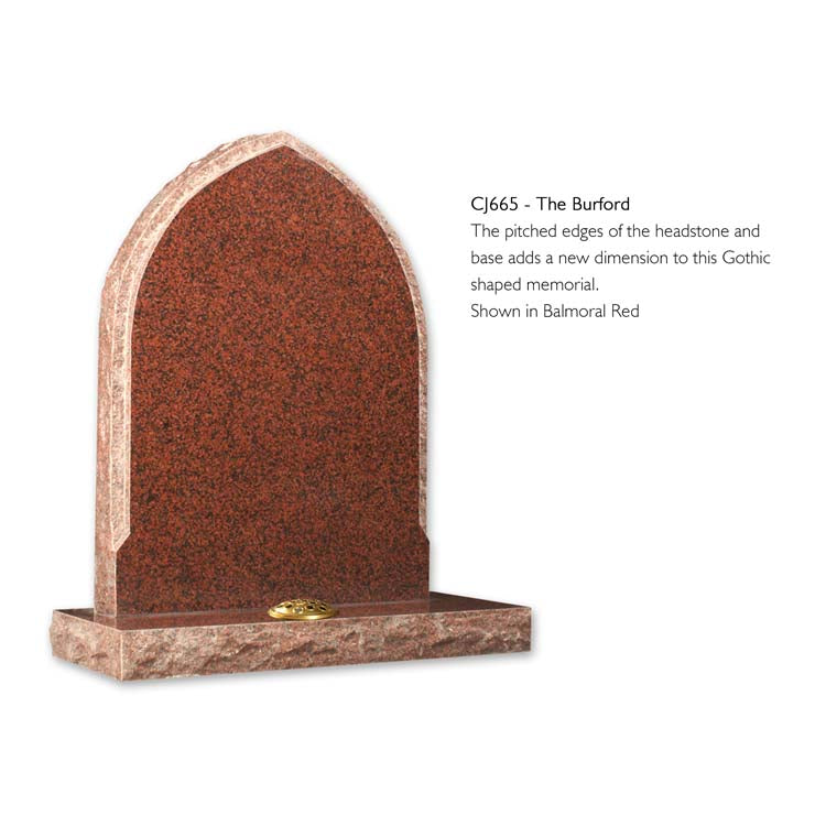 The pitched edges of the headstone and base adds a new dimension to this Gothic shaped memorial. Shown in Balmoral Red.