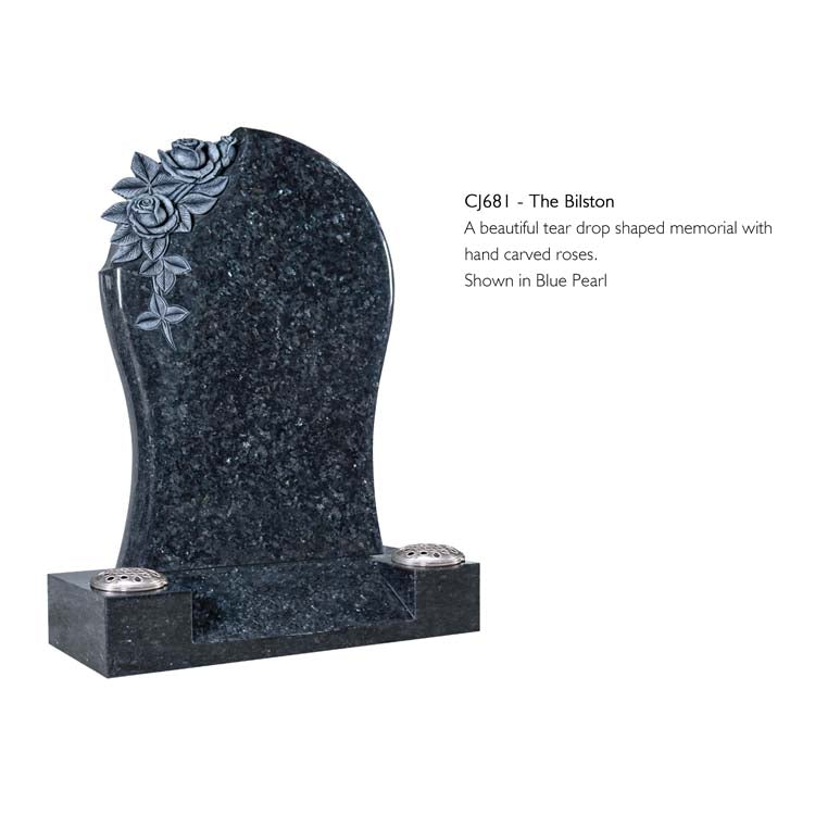A beautiful tear drop shaped memorial with hand carved roses. Shown in Blue Pearl.
