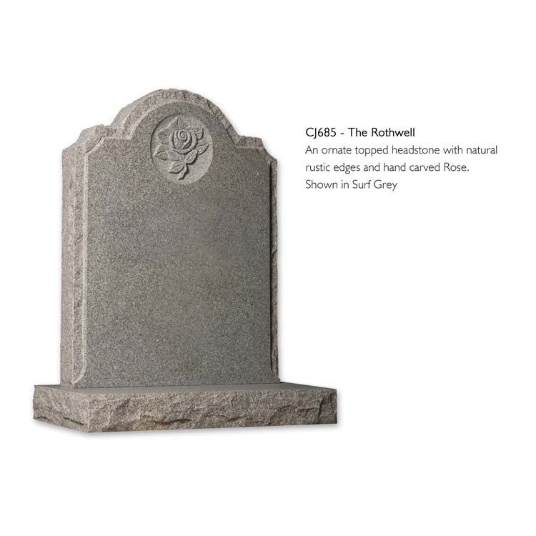 An ornate topped headstone with natural rustic edges and hand carved rose. Shown in Surf Grey.