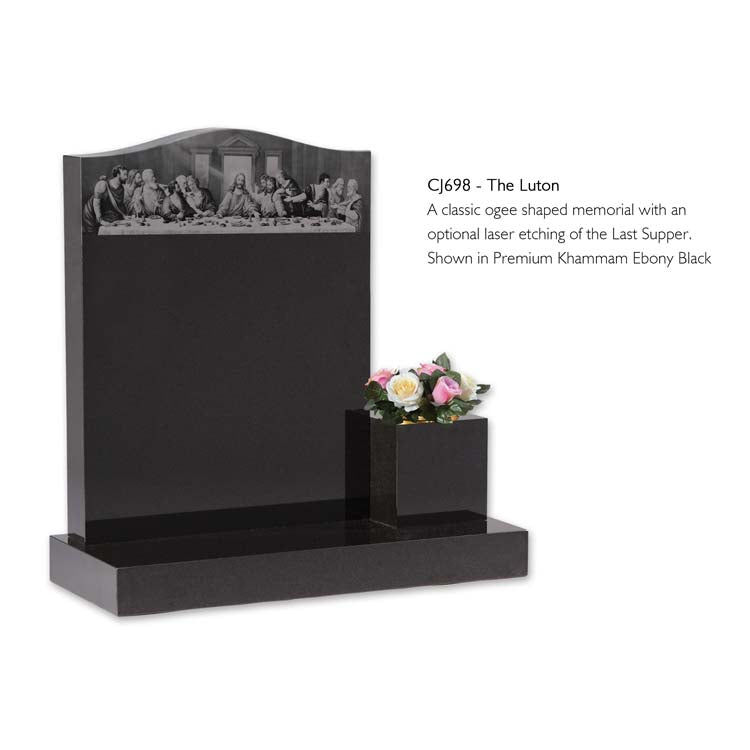 A classic Ogee shaped memorial with an optional laser etching of the Last supper. Shown in Premium Khammam Ebony Black.