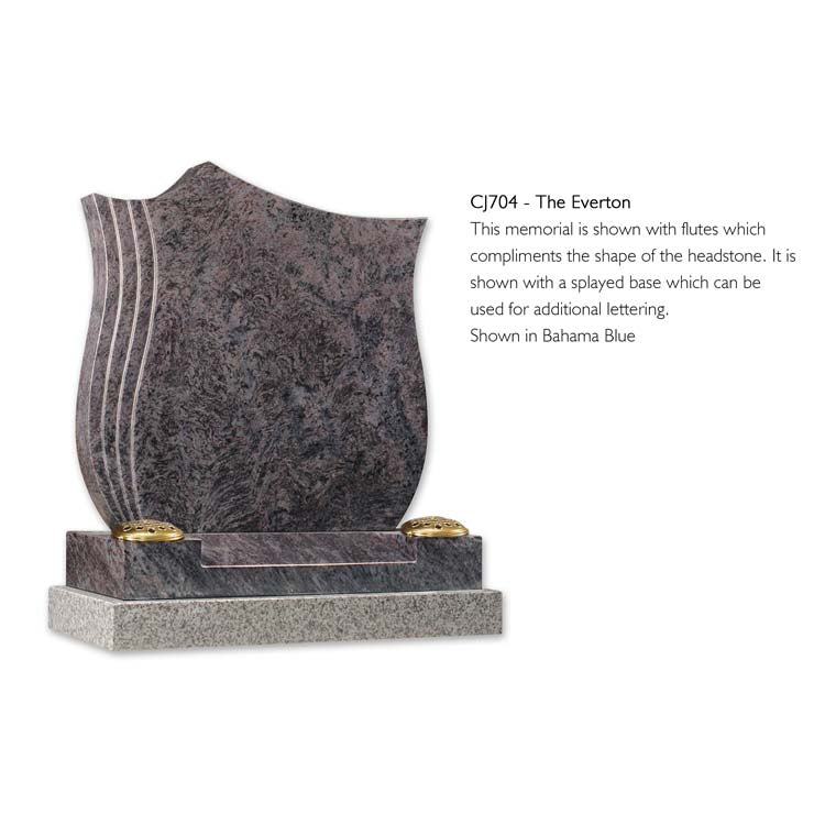This memorial is shown with flutes which compliment the shape of the headstone. It is shown with a splayed base which can be used for additional lettering. Shown in Bahama Blue.