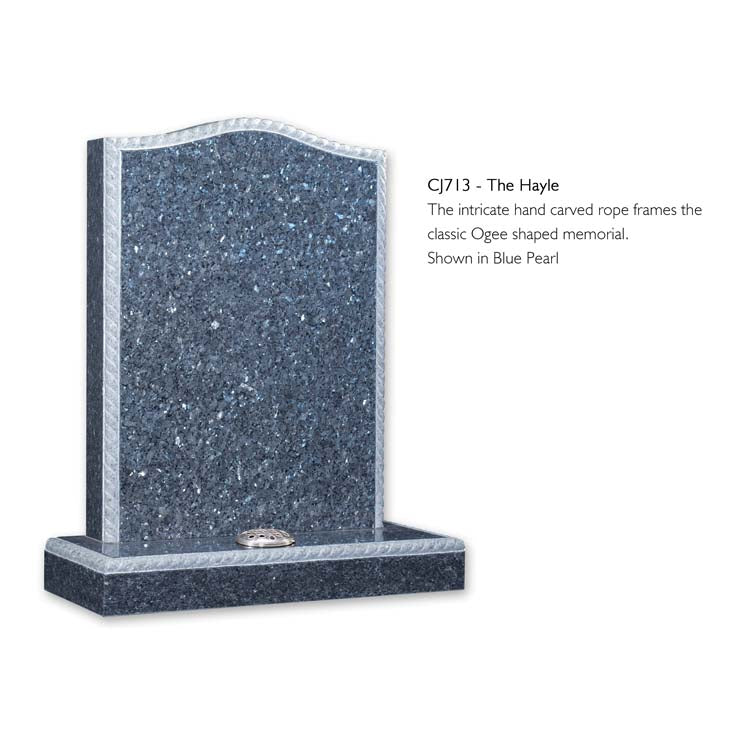 The intricate hand carved rope frames the classic Ogee shaped memorial. Shown in Blue Pearl.