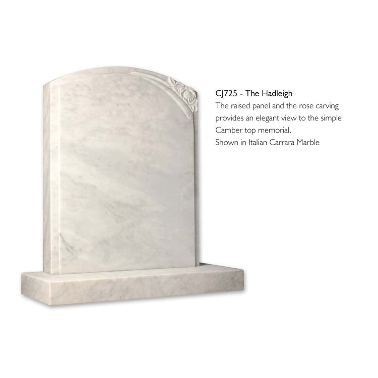 The raised panel and the rose carving provides an elegant view to the simple Camber top memorial. Shown in Italian Carrara Marble.