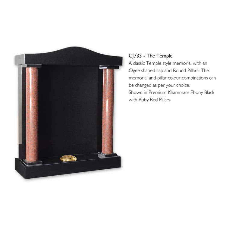 A classic Temple style memorial with Ogee shaped cap and Round Pillars. The memorial and pillar colour combinations can be changed as per your choice. Shown in Premium Khammam Ebony Black with Ruby Red Pillars.