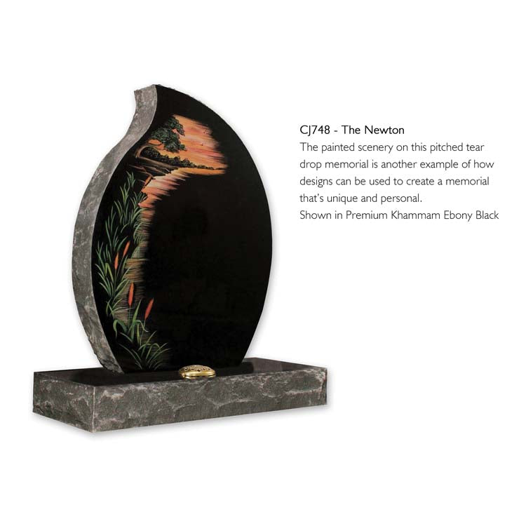 The painted scenery on this pitched tear drop memorial is another example of how designs can be used to create a memorial that's unique and personal. Shown in Premium Khammam Ebony Black.
