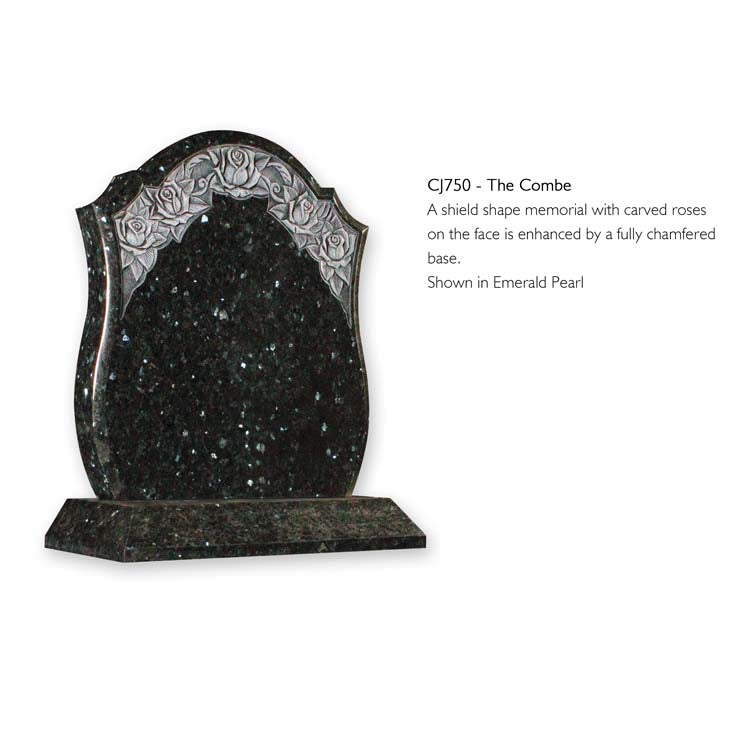 A shield shape memorial with carved roses on the face is enhanced by a fully chamfered base. Shown in Emerald Pearl.