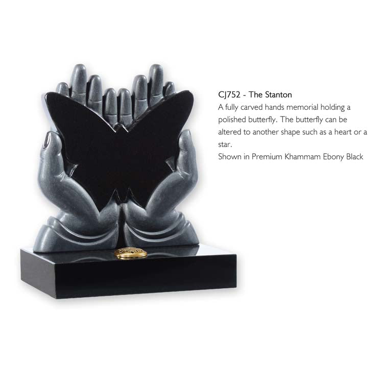 A fully carved hands memorial holding a polished butterfly. The butterfly can be altered to another shape such as a heart or a star. Shown in Premium Khammam Ebony Black.