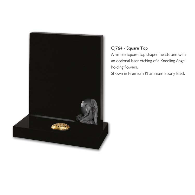 A simple Square top shaped headstone with an optional laser etching of a Kneeling Angel holding flowers. Shown in Premium Khammam ebony Black.