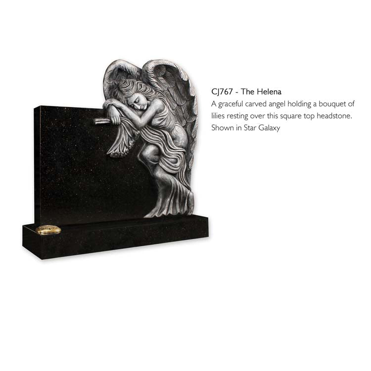 A graceful carved angel holding a bouquet of lilies resting over this square top headstone. Shown in Star Galaxy.