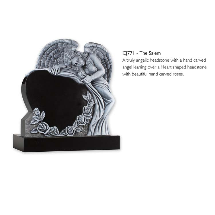 A truly angelic headstone with a hand carved angel leaning over a Heart shaped headstone with beautiful hand carved roses. Shown in Premium Khammam Ebony Black.