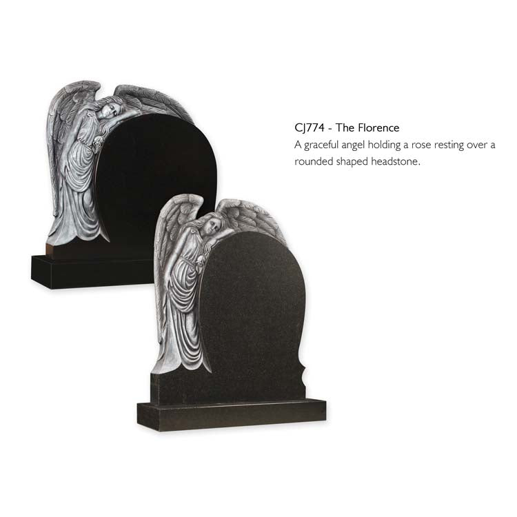 A graceful angel holding a rose resting over a rounded shaped headstone .Shown in Premium Khammam Ebony Black and South African Dark Grey.