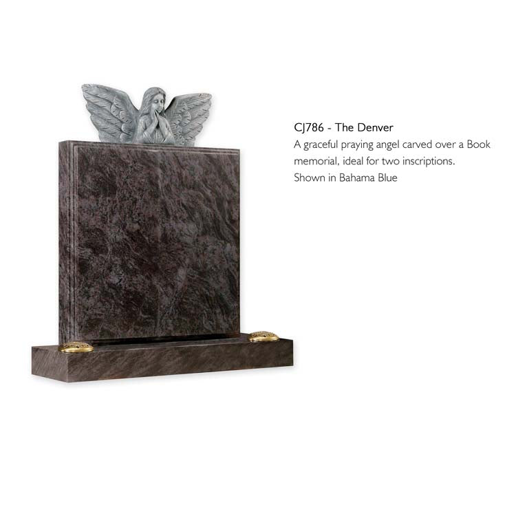A graceful praying angel carved over a book memorial, ideal for two inscriptions. Shown in Bahama Blue with Antique Finish.