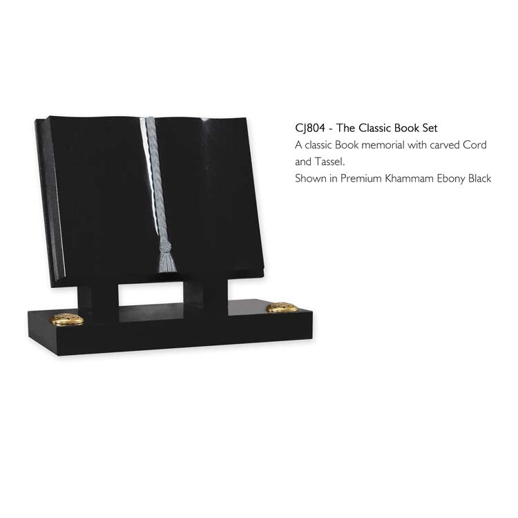 A classic Book memorial with carved Cord and Tassel. Shown in Premium Khammam Ebony Black.
