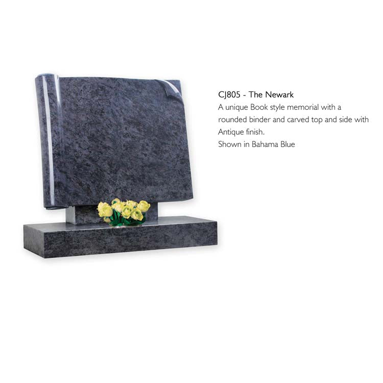 A unique Book style memorial with a rounded binder and carved top and side with Antique finish. Shown in Bahama Blue.