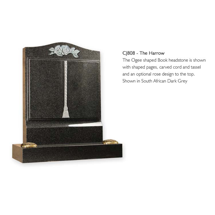 The Ogee shaped book headstone is shown with shaped pages, carved cord and tassel and an optional rose design to the top. Shown in South African Dark Grey.