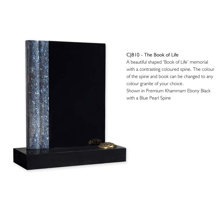 A beautiful shaped Book of Life memorial with a contrasting coloured spine. The colour of the spine and book can be changed to any colour granite of your choice. Shown in Premium Khammam Ebony Black with a Blue Pearl Spine.