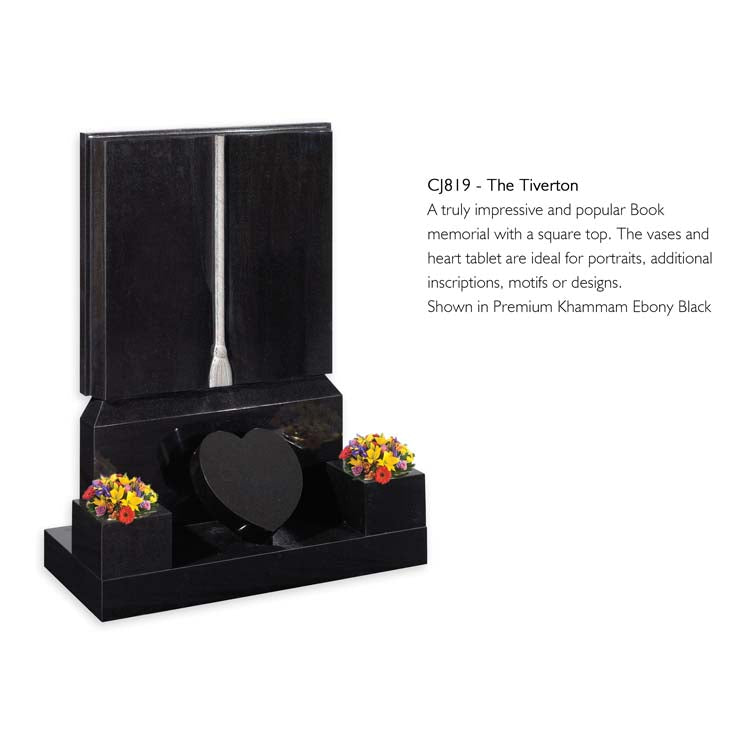 A truly impressive and popular Book memorial with a square top. The vases and heart tablet are ideal for portraits, additional inscriptions, motifs or designs. Shown in Premium Khammam Ebony Black.