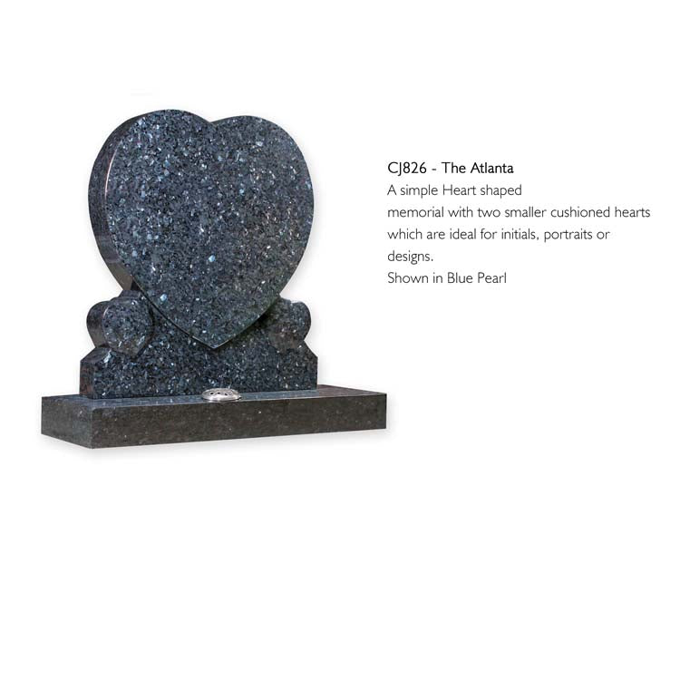 A simple Heart shaped memorial with two smaller cushioned hearts which are ideal for initials, portraits or designs. Shown in Blue Pearl.