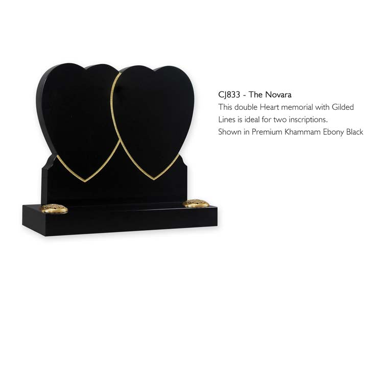 This double Heart memorial with Gilded Lines is ideal for two inscriptions. Shown in Premium Khammam Ebony Black.